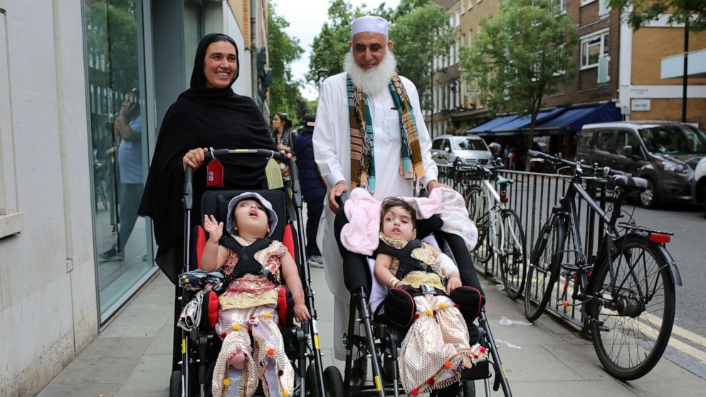 Twins Safa and Marwa Ullah, who had been born conjoined, leaving the hospital in London this month with their mother and grandfather.